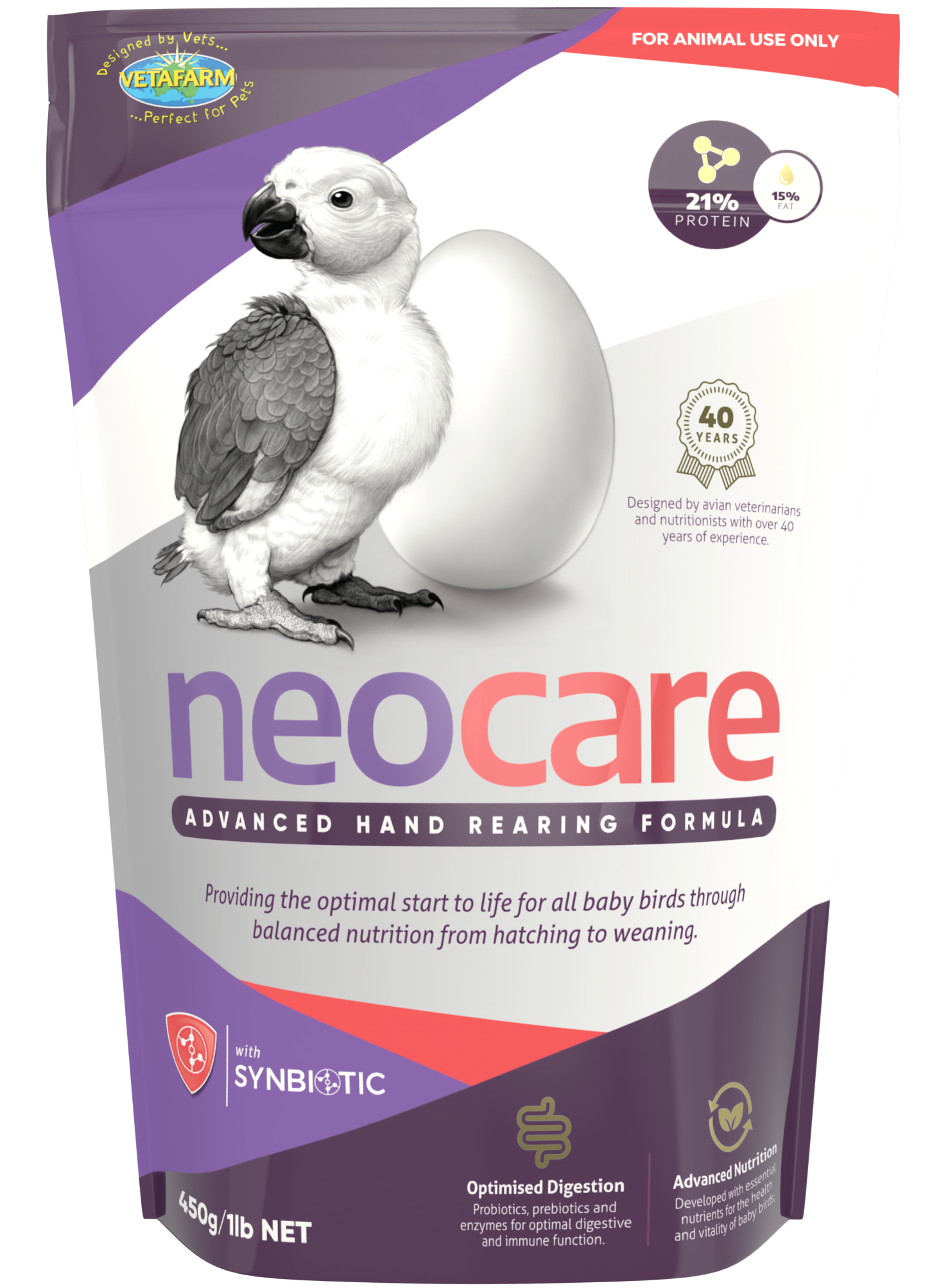Can use with: Neocare should not be used with any other supplement, unless advised by a veterinarian. Neocare is a veterinary balanced food, mixing other foods or supplements will dilute the nutrition and unbalance a young birds diet. If hand feeding from hatching, an electrolyte formula should be fed for the first 24+ hrs or until the bird passes it’s first dropping. Neocare is then fed at a runny consistency and thickened over a period of days.